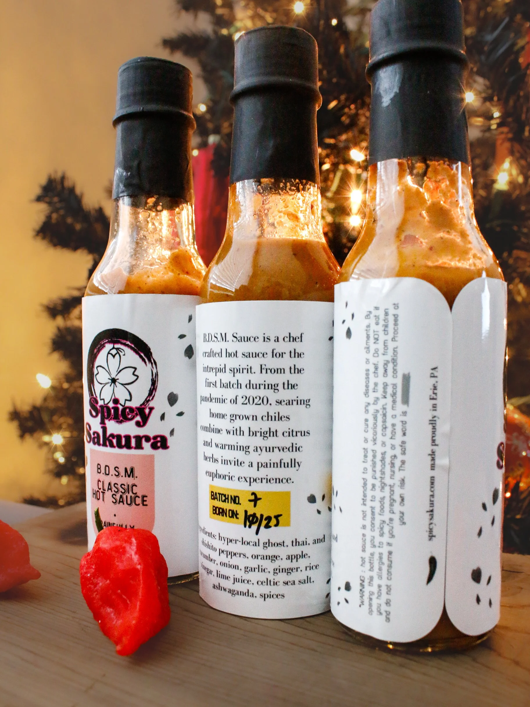 Since then around the holidays, a few batches of BDSM Hot are made along with a special holiday themed more “entry level” hot. These sauce now also incorporate “hyper-local” peppers grown by Spicy Sakura, as well as ashwaganda root added in later recipes to bring calm and well-being.